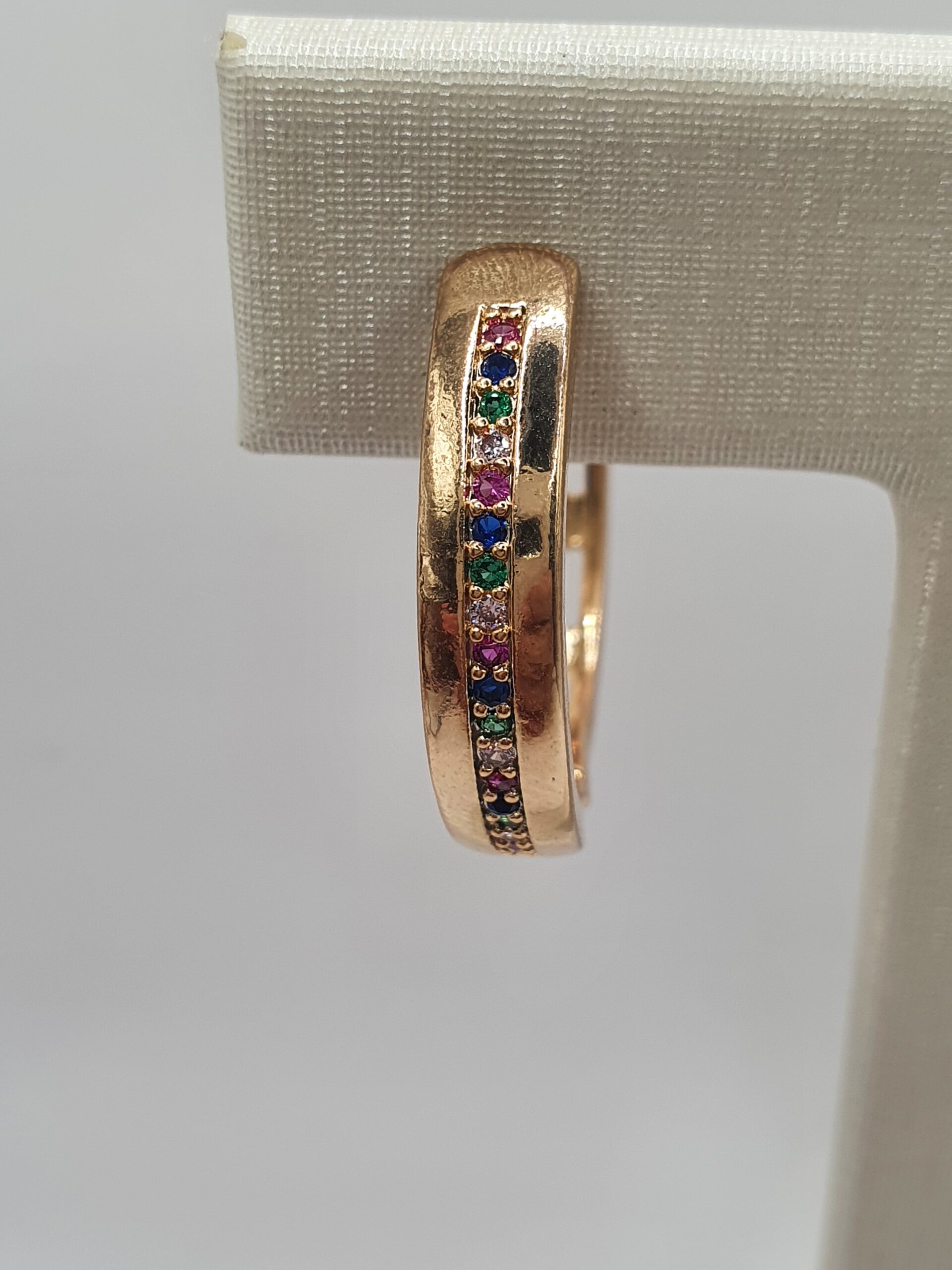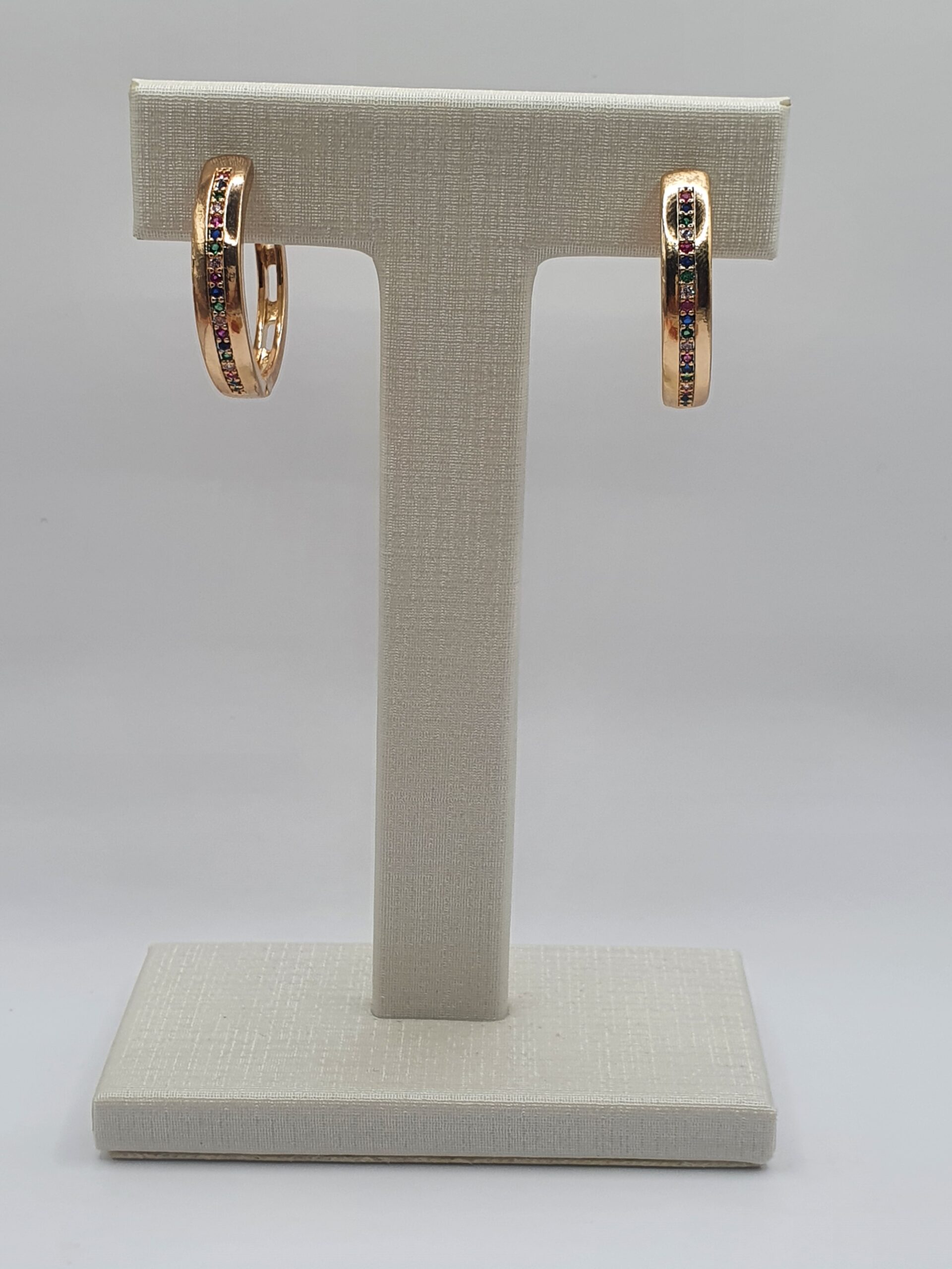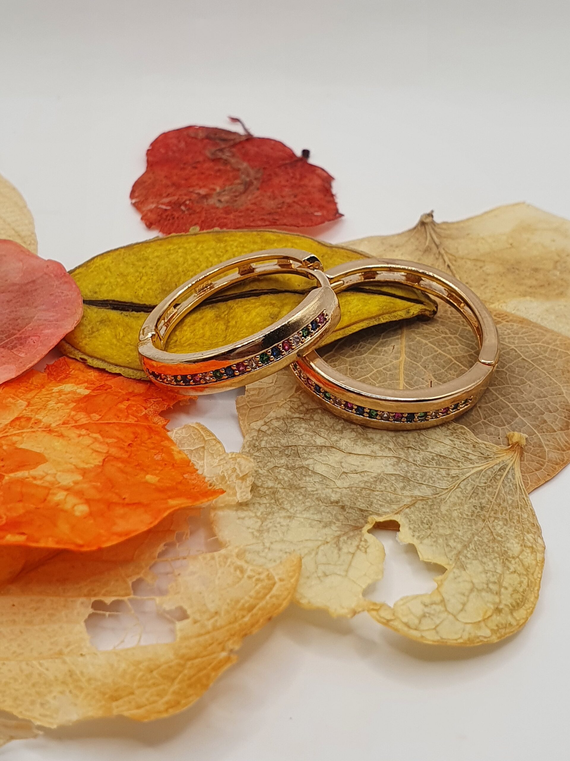 Peças folheadas douradas, cravejadas em zircônias coloridas.