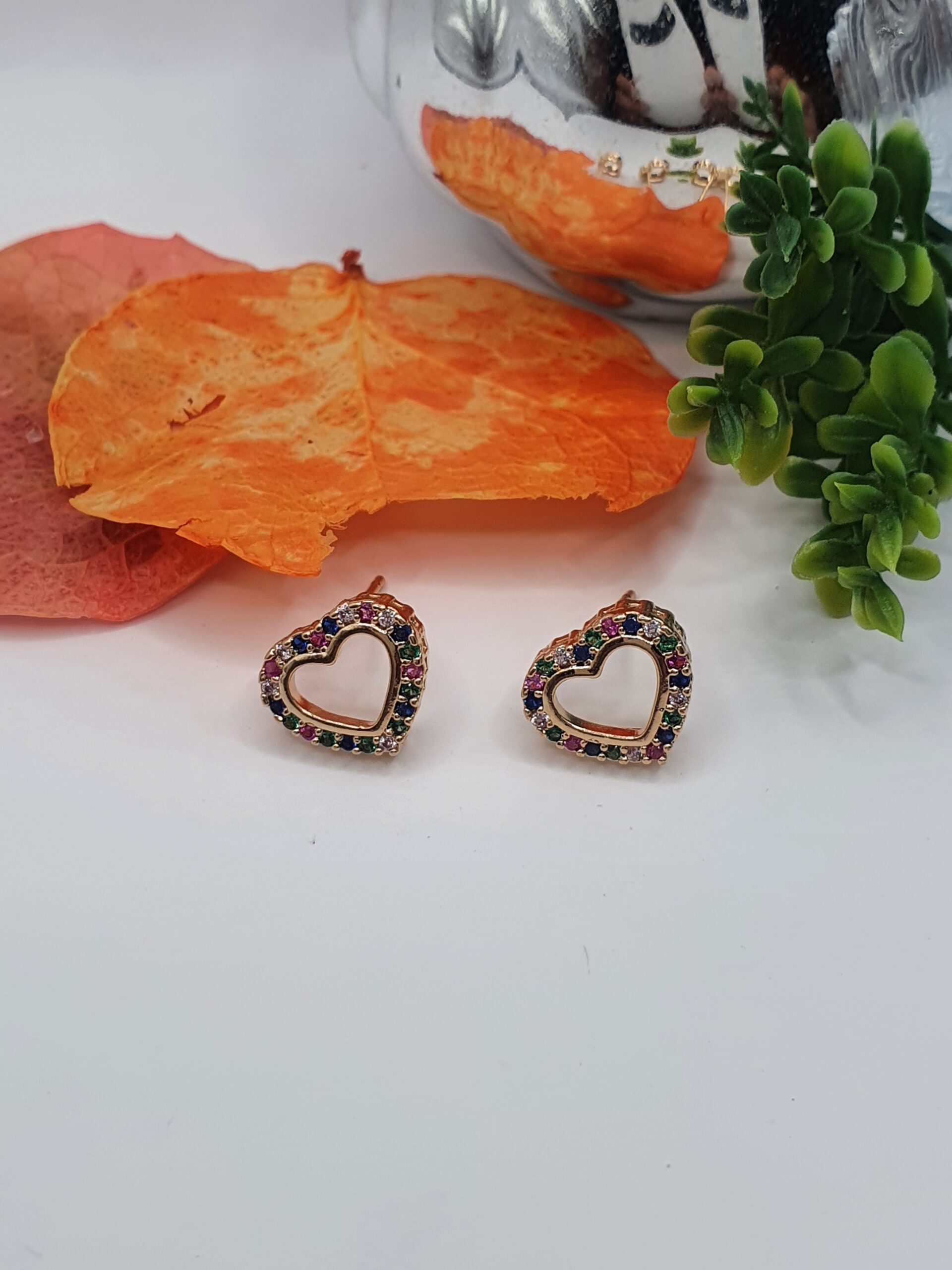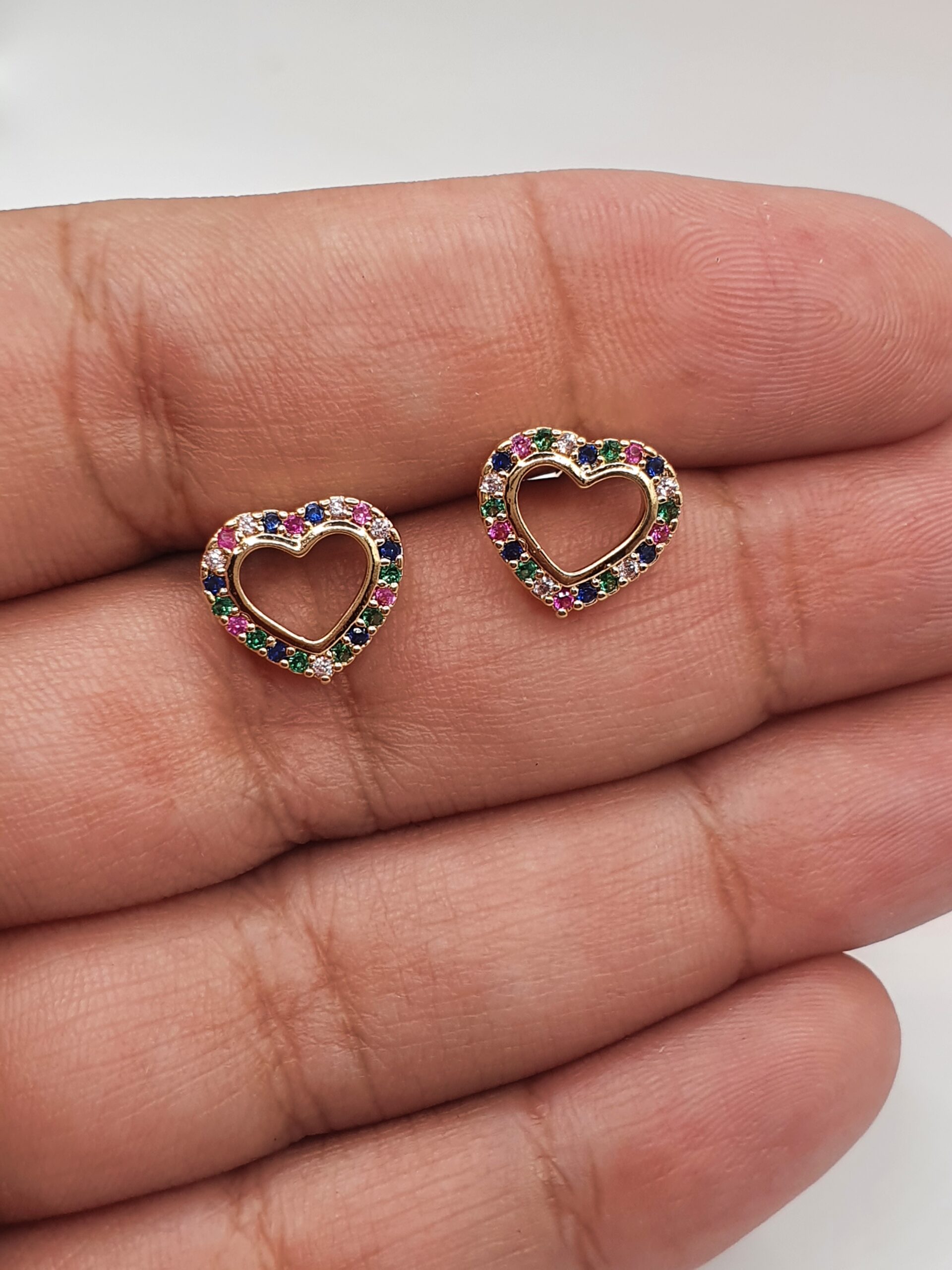 Peças folheadas douradas, brinco pequeno cravejado com micro zircônias coloridas.