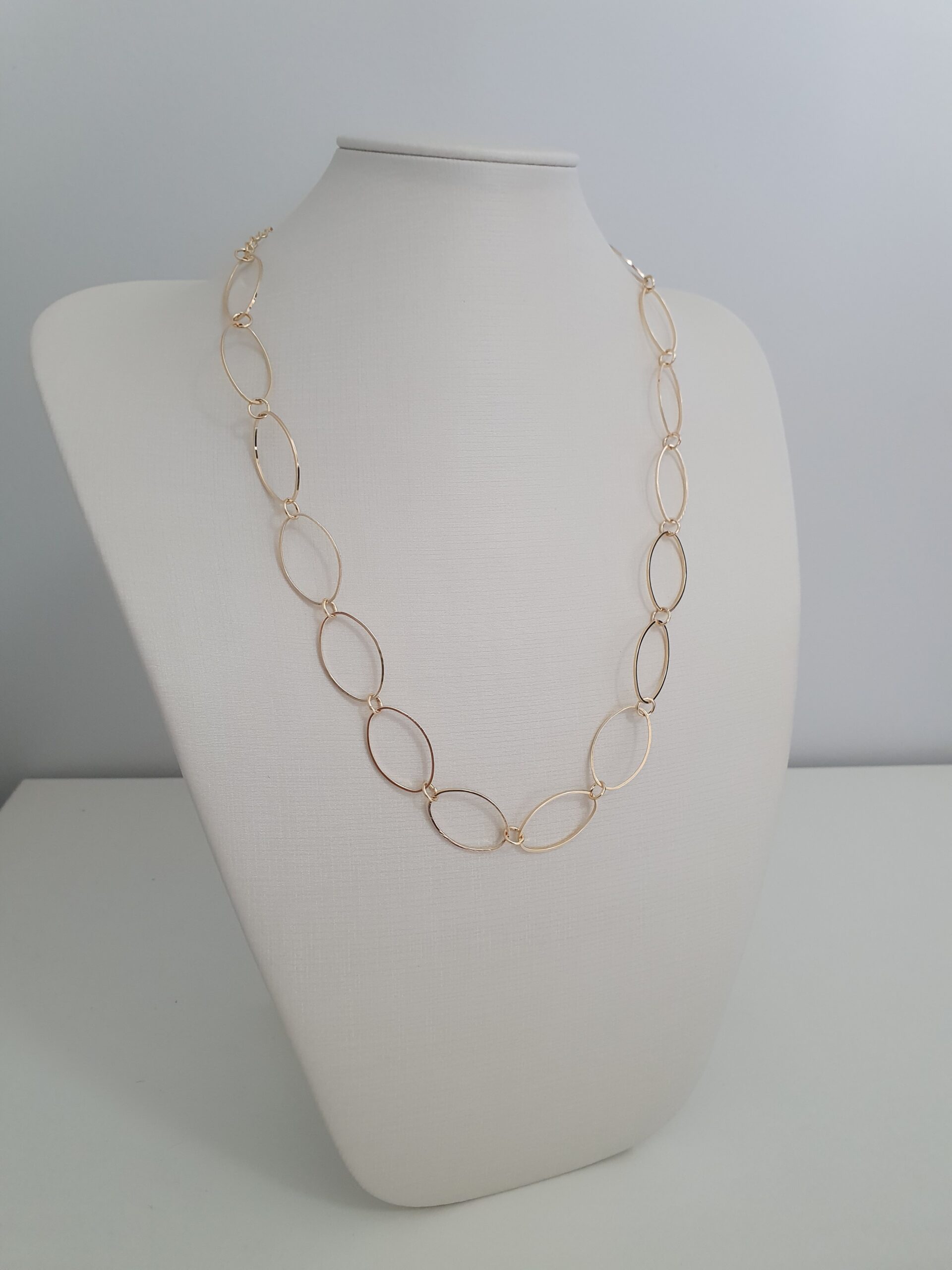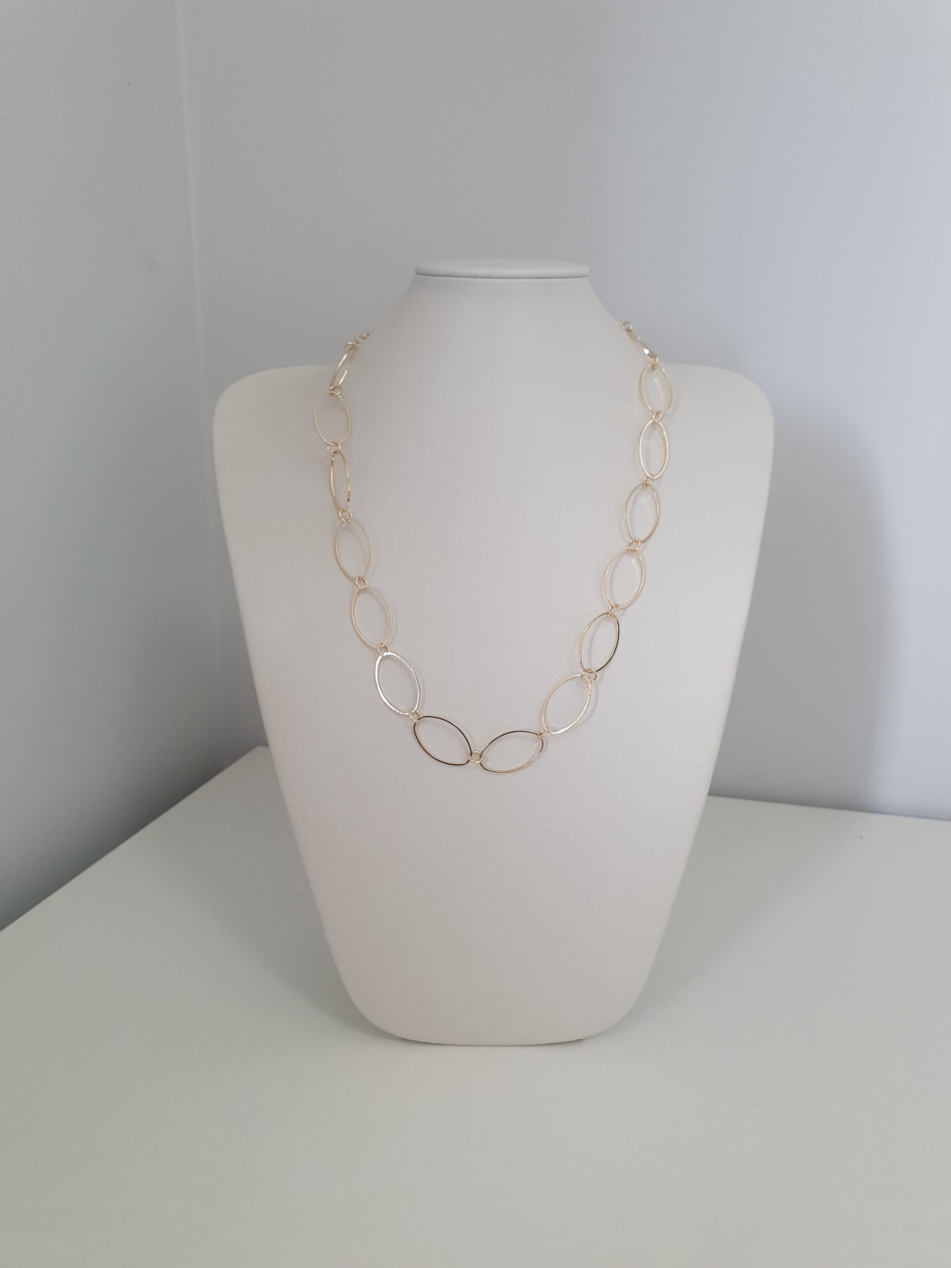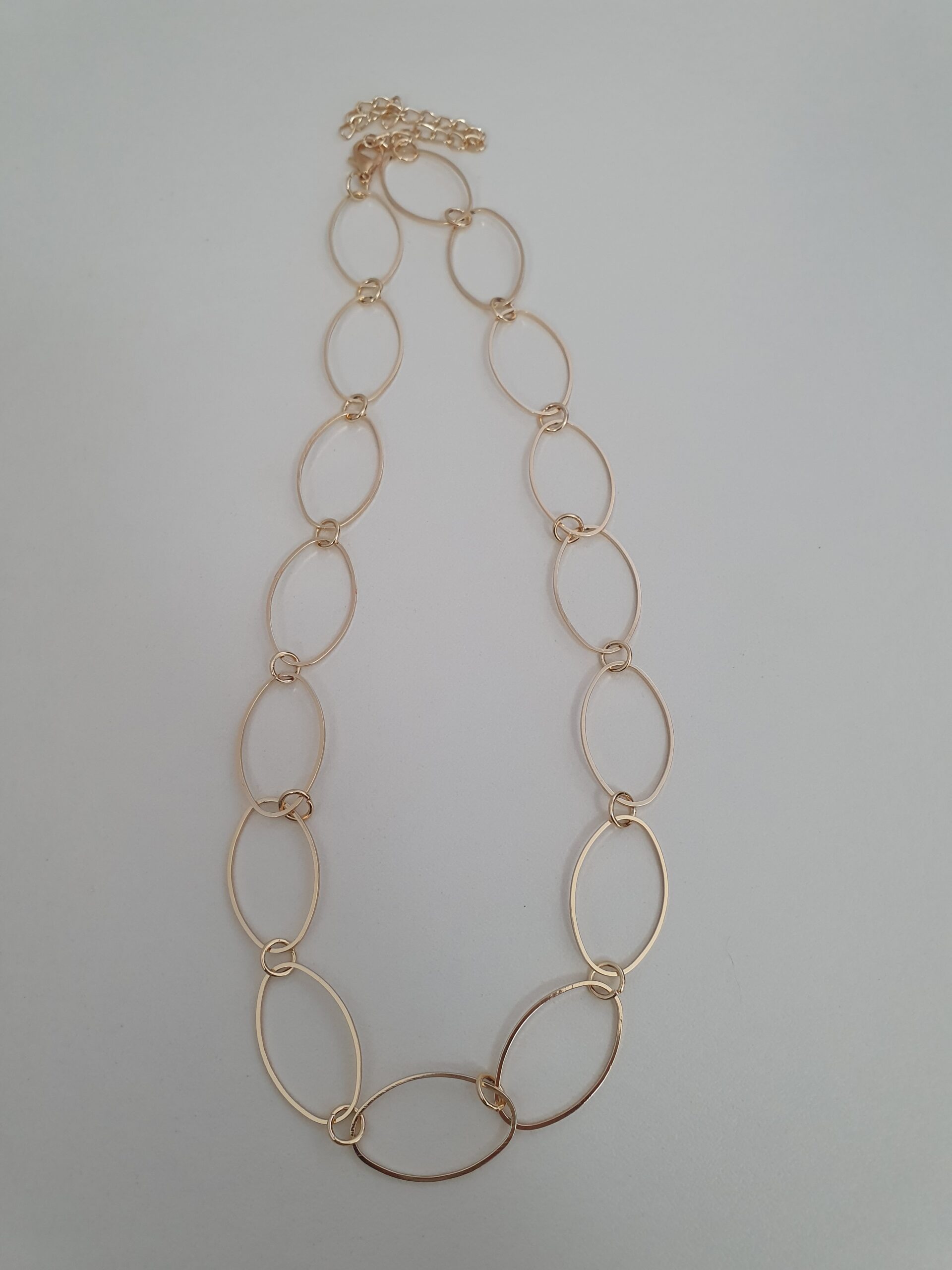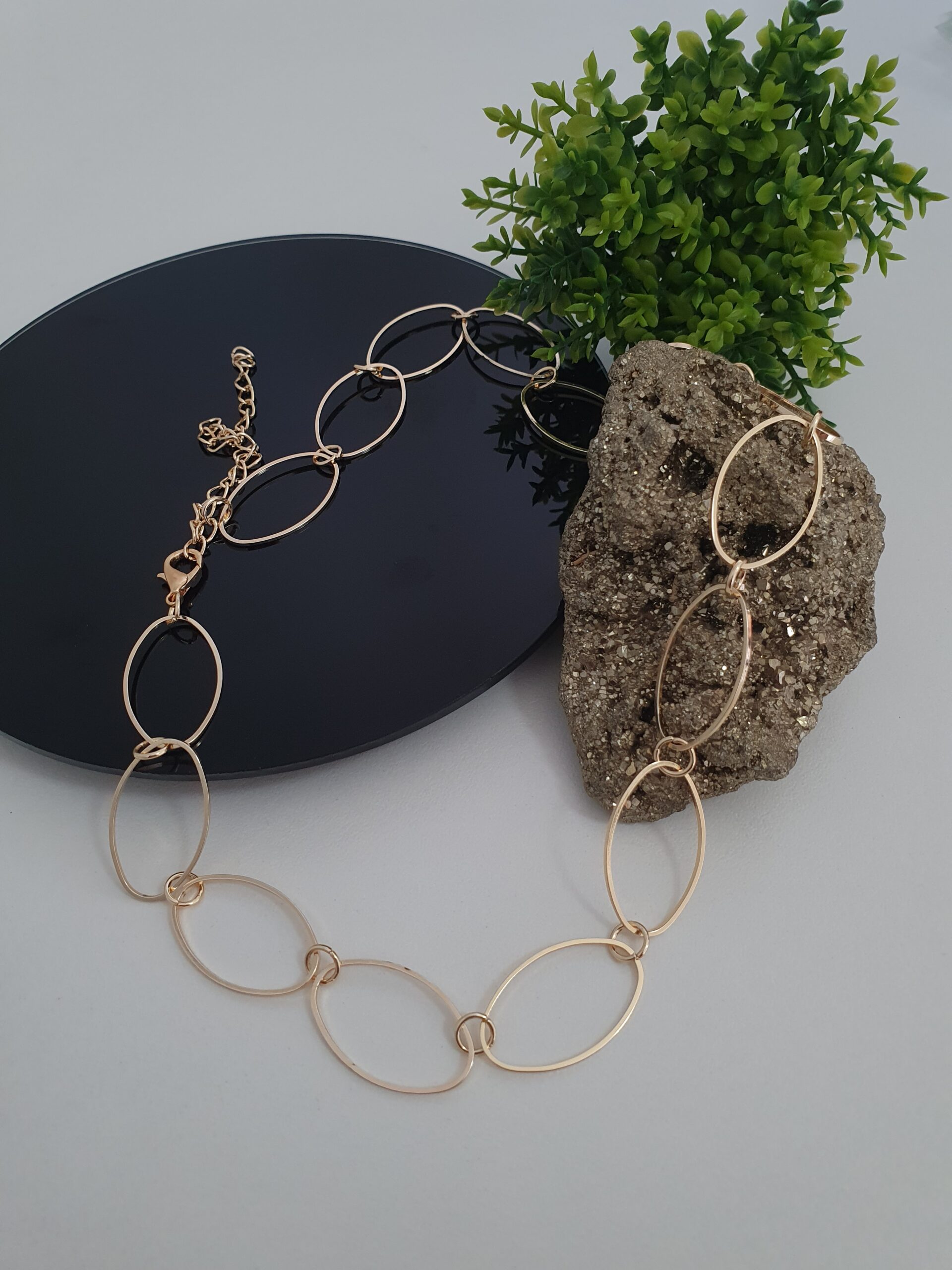 Peça folheada dourada estilo correntaria com elos ovalados, aproximadamente 25 cm de altura.