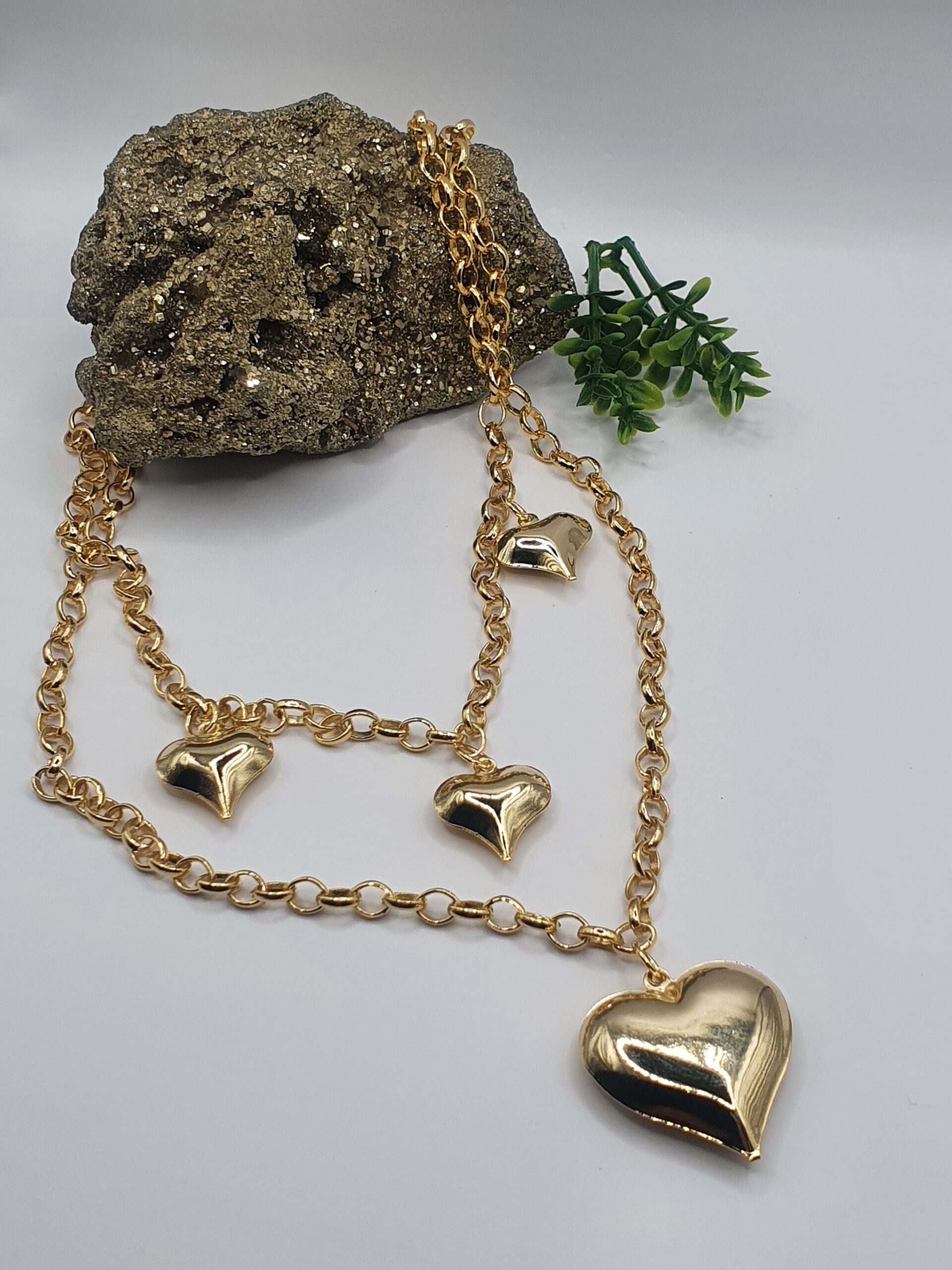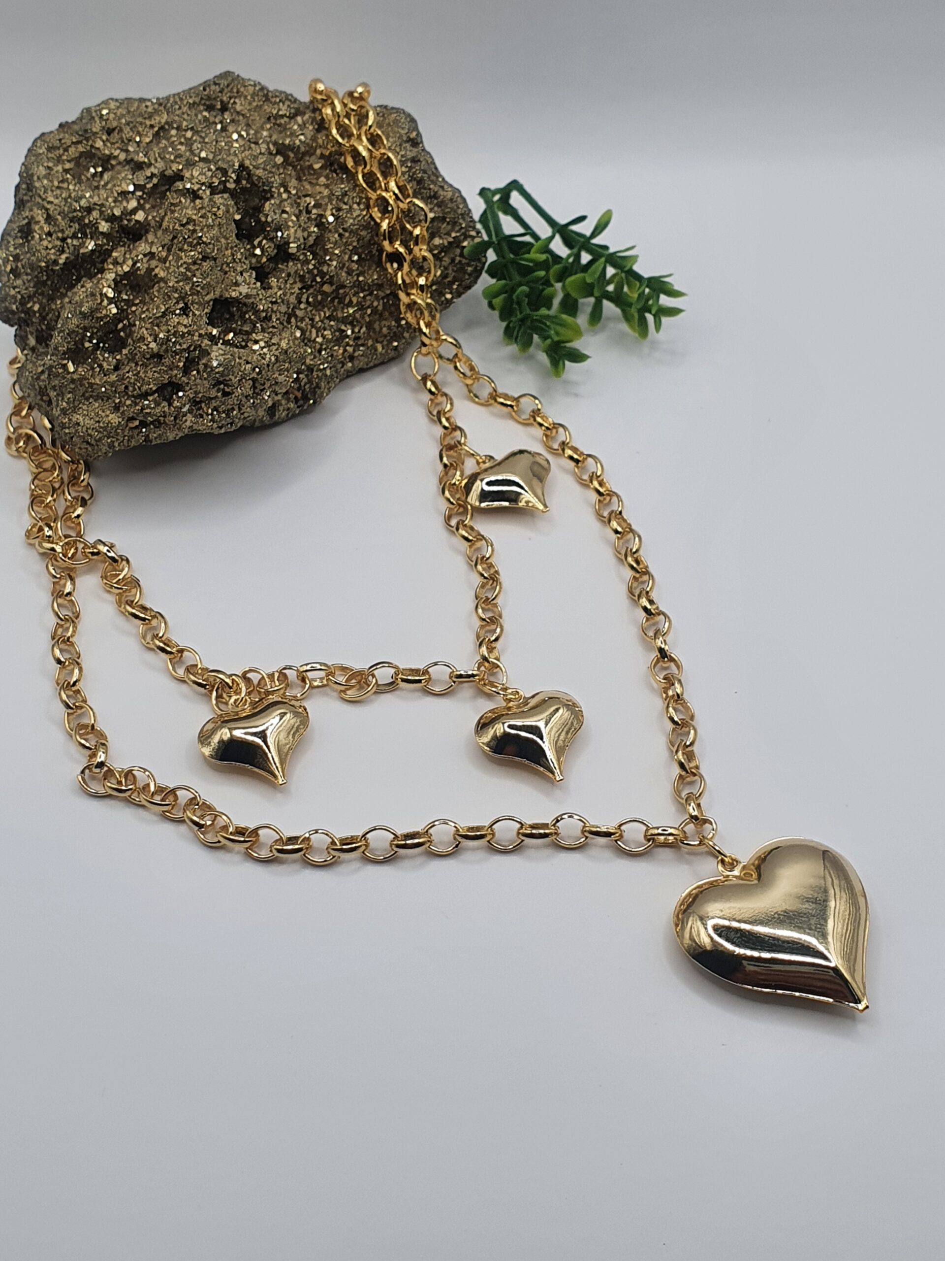Peça folheada dourada com corrente em correntaria dupla e pingentes em coração.