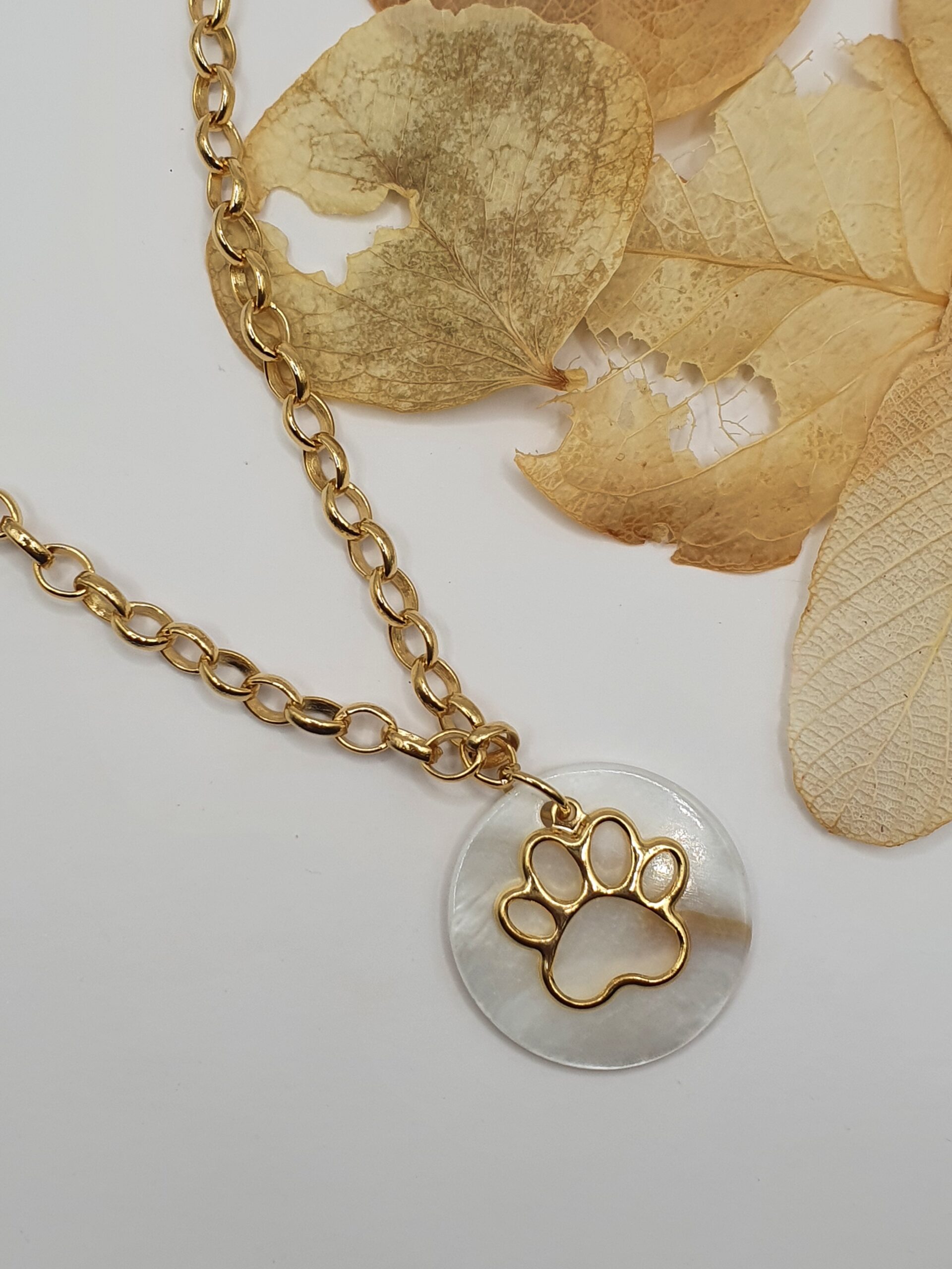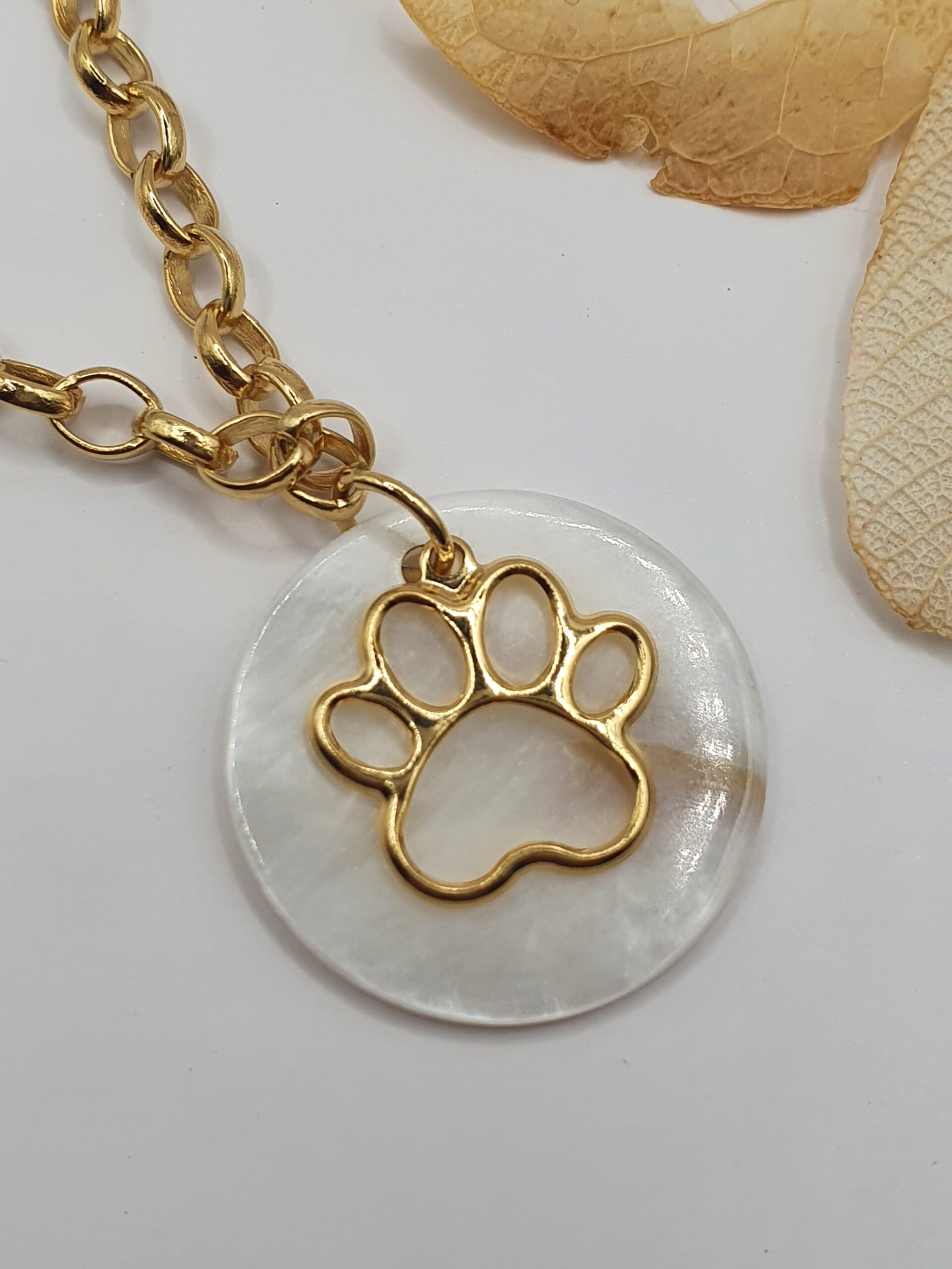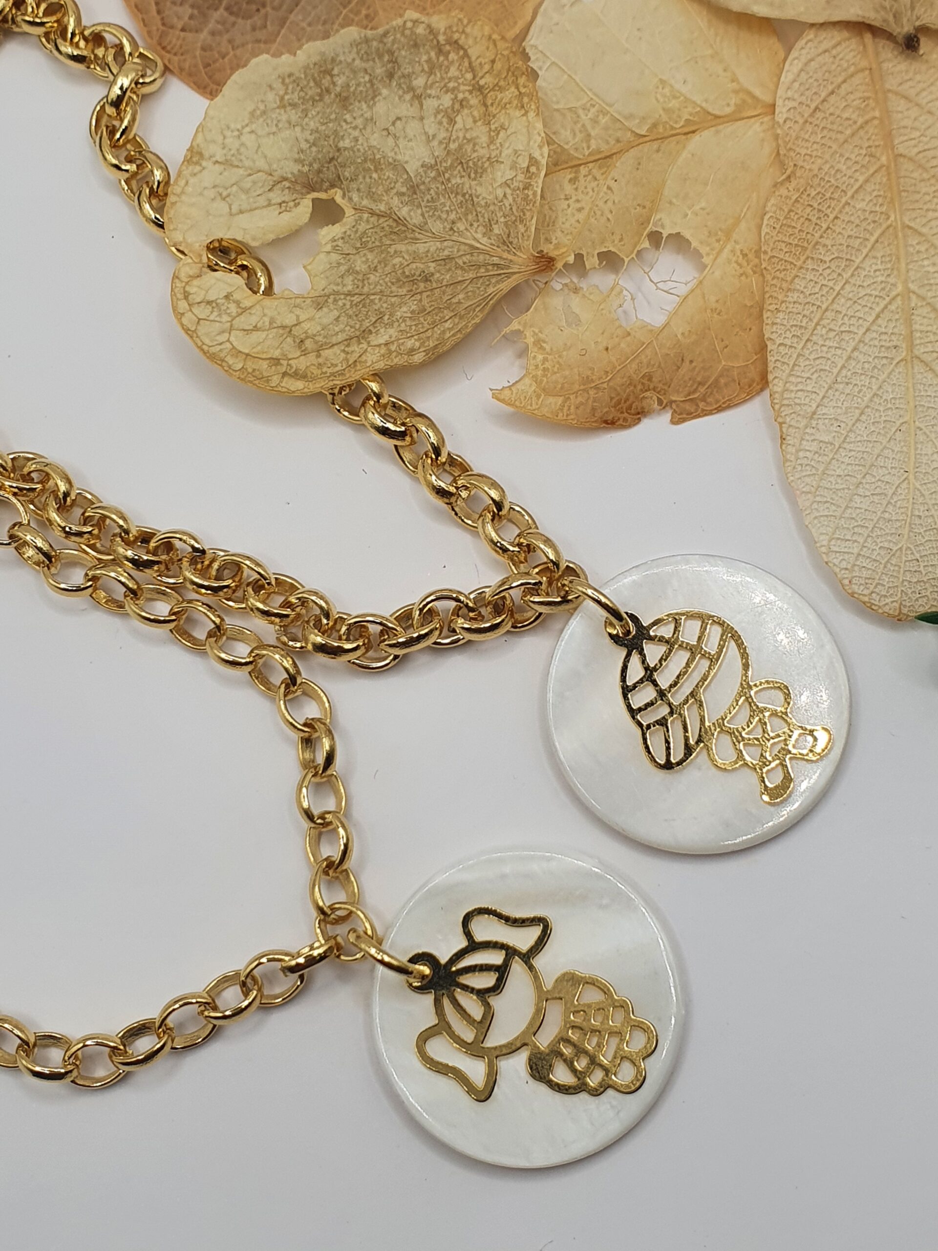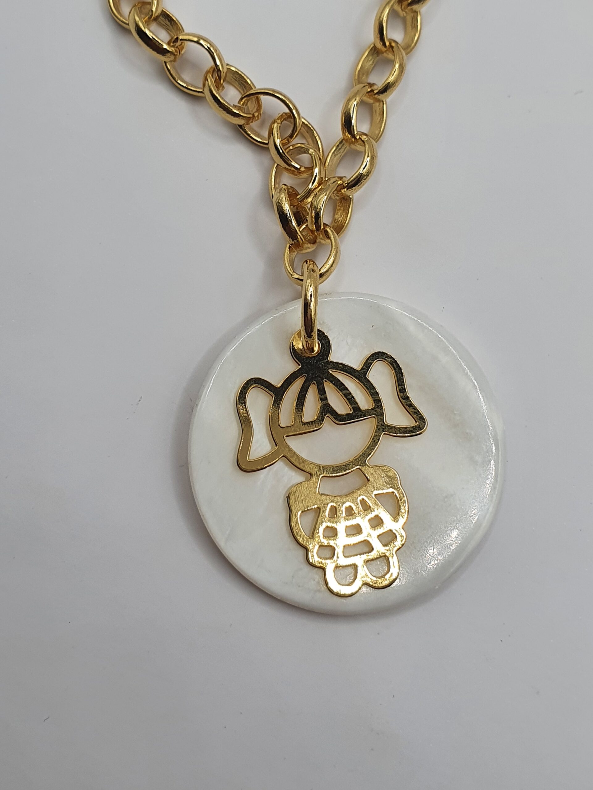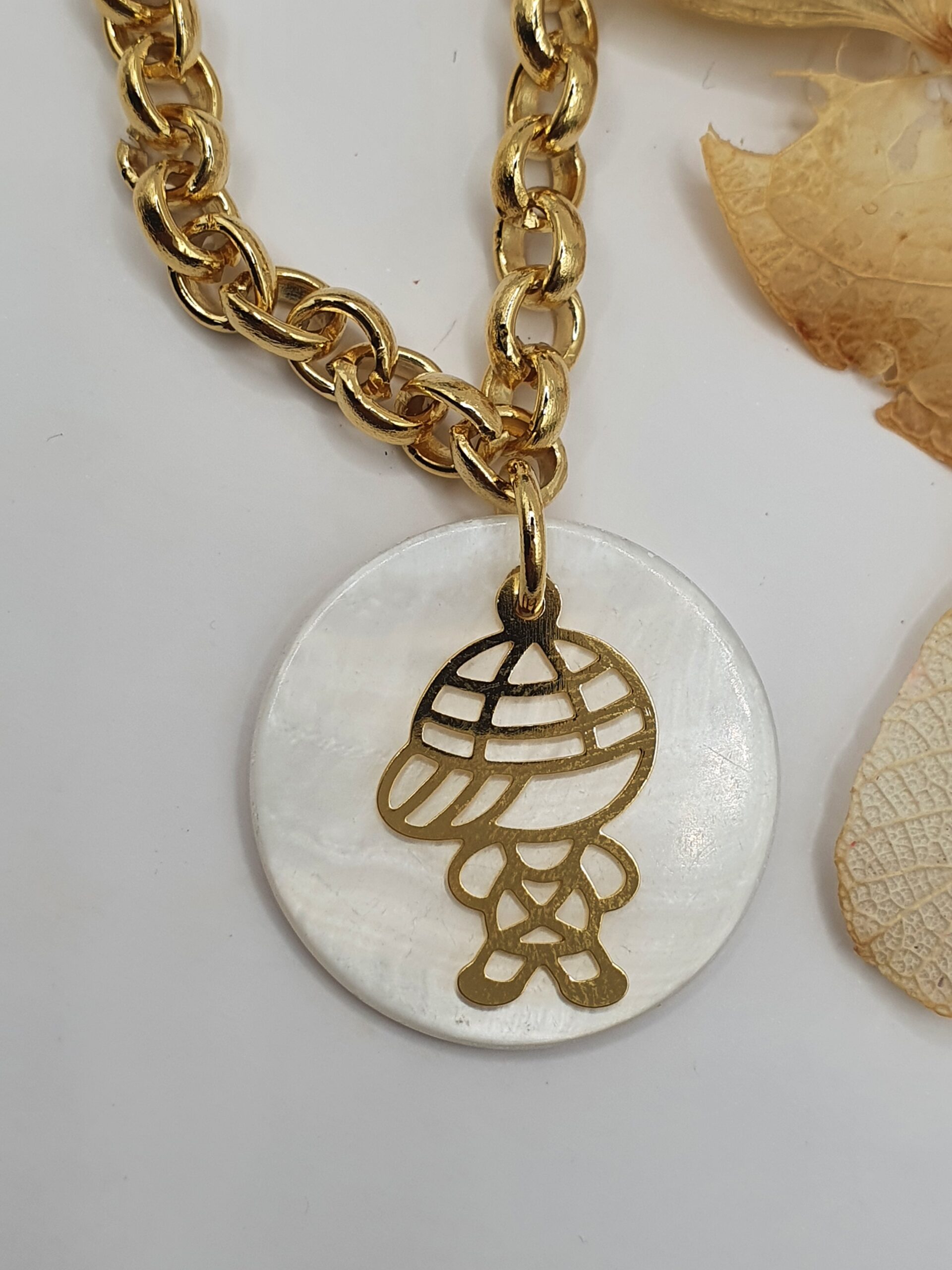 Peça folheada dourada, colar em correntaria com medalha em madrepérola.