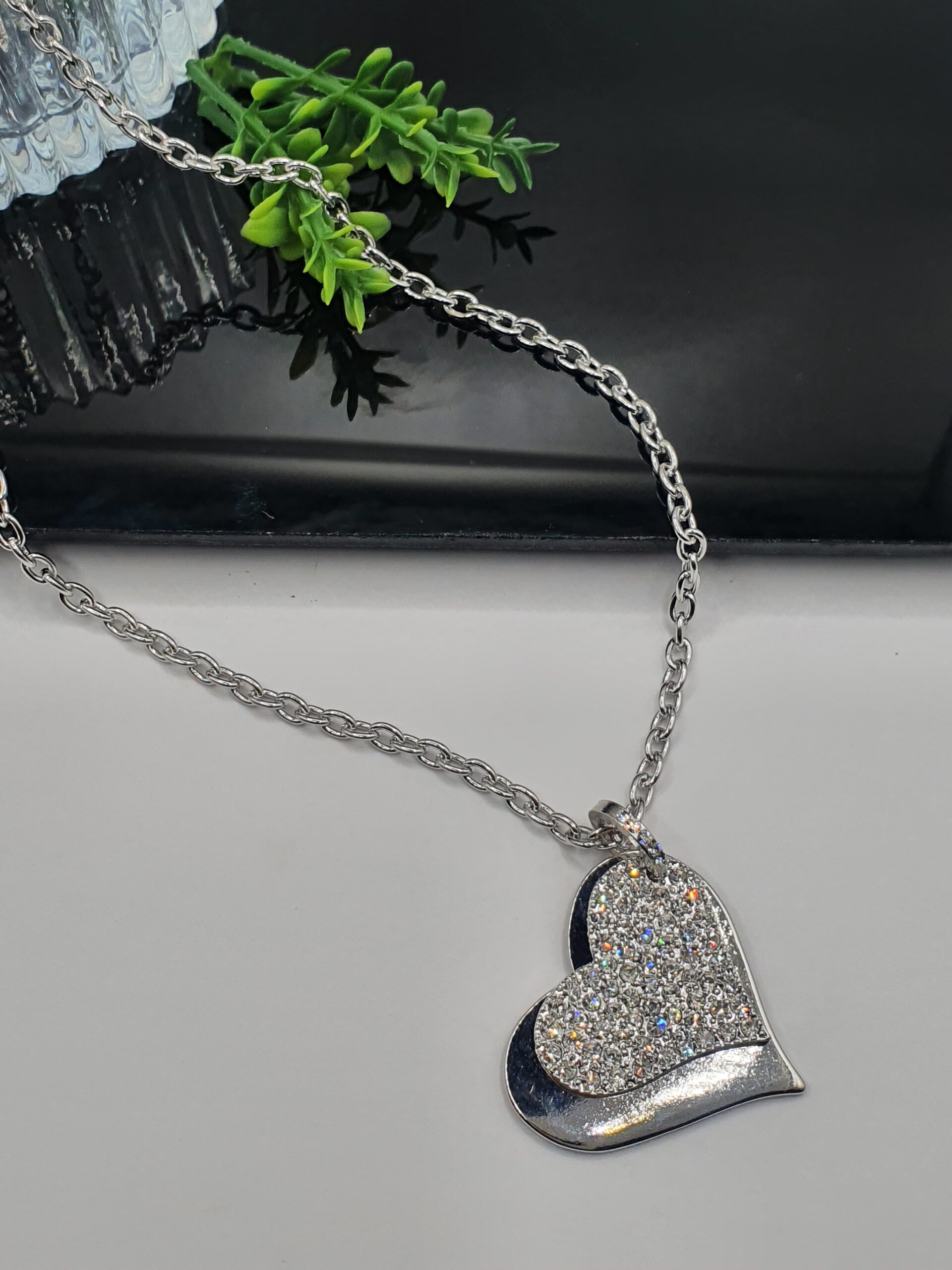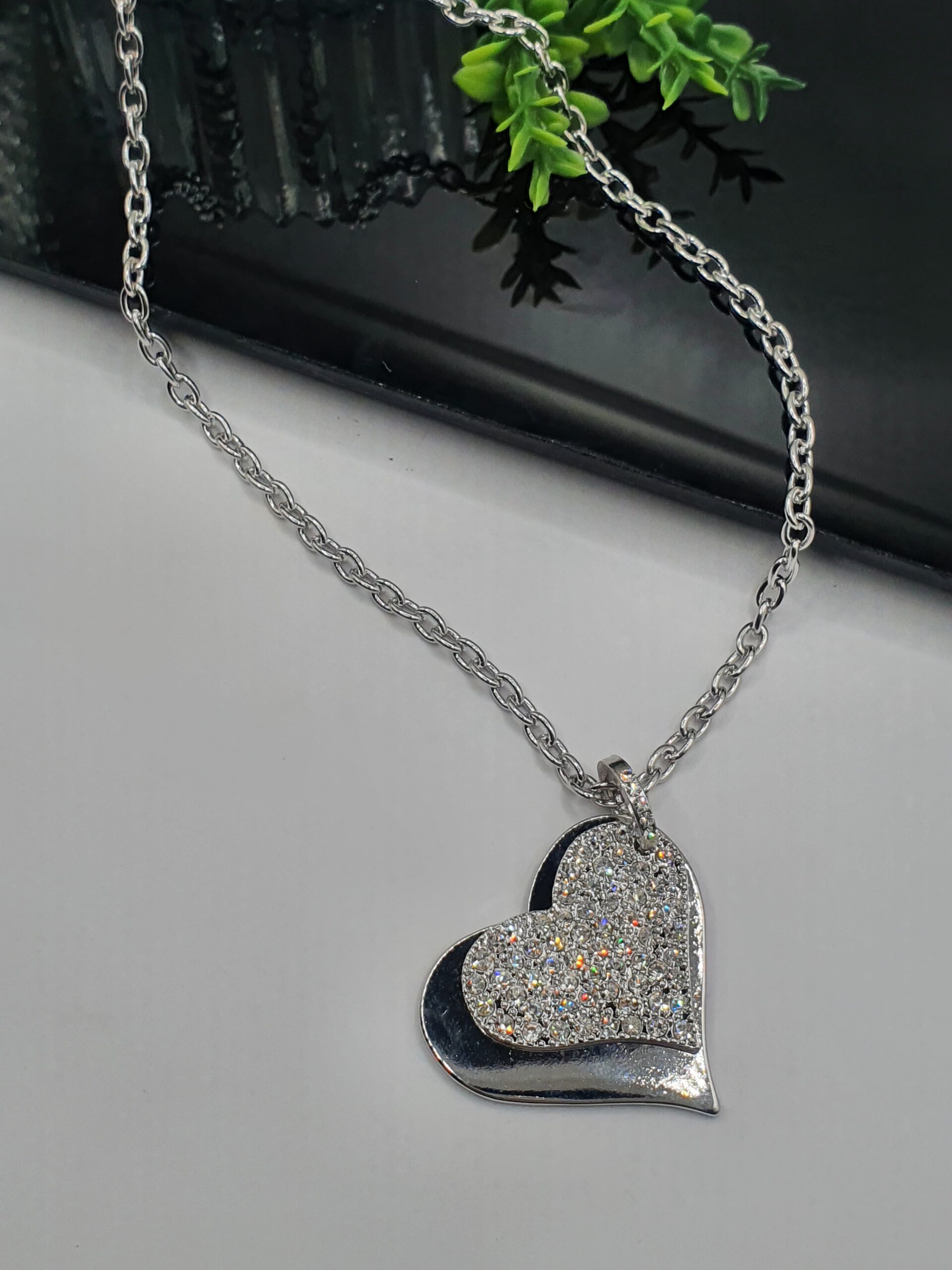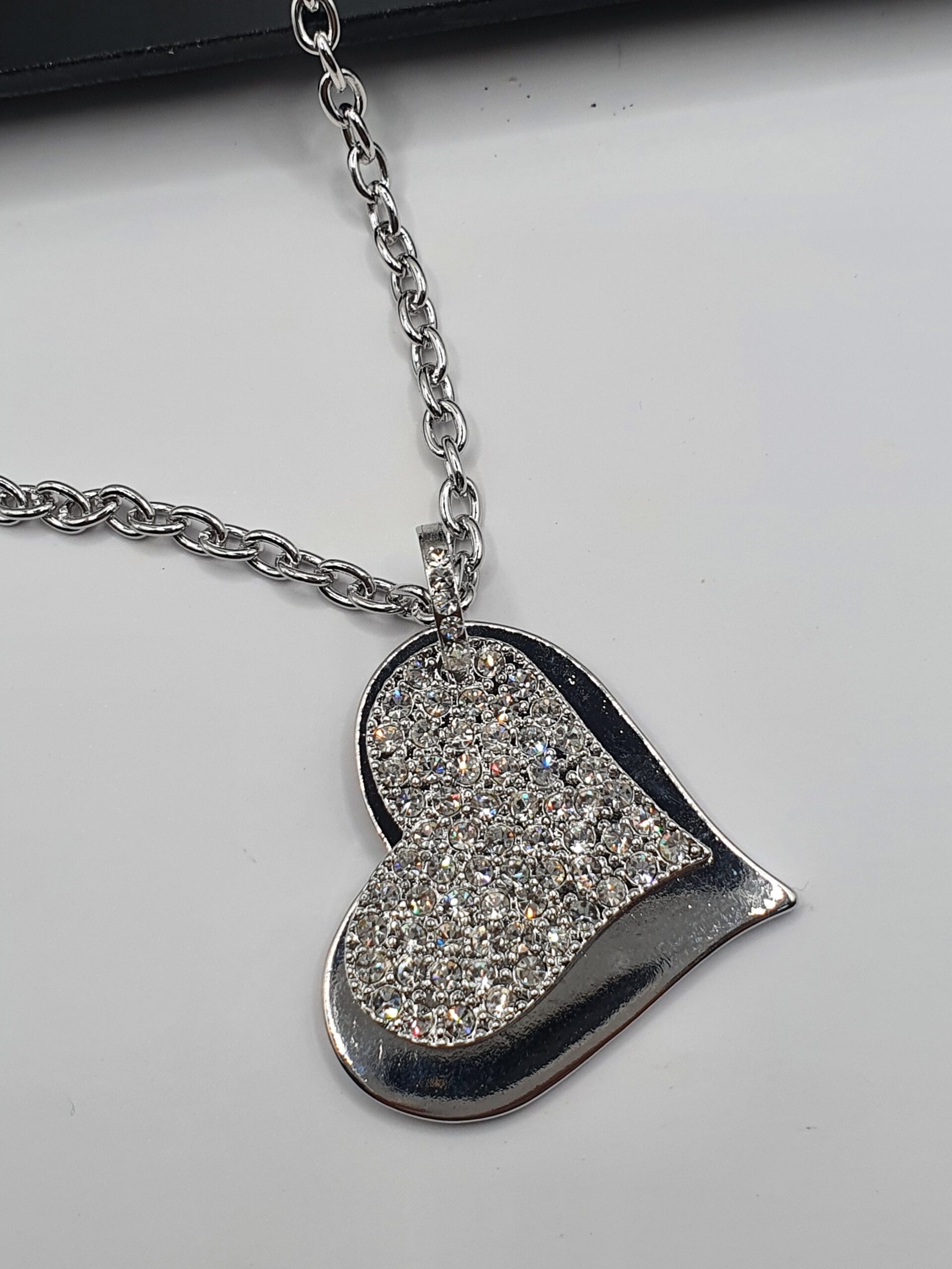 Peça folheada ródio branco, com pingente uma chapa de coração e pingente coração cravejado,